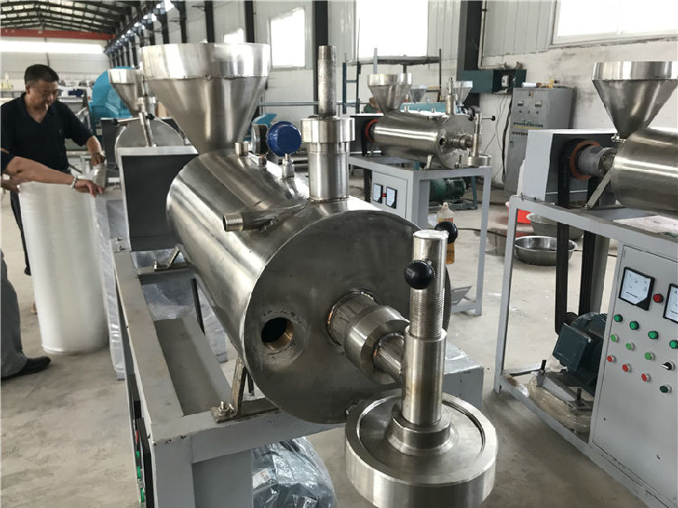 1、每天工作前機械預熱,保養完畢后,投料時先不要急于安裝磨具,先啟動機械將機械內部余留剩料擠壓出來,擠壓出的圓柱呈軟料透明狀時在將磨具固定,進行正常作業。這樣的工序可以避免機械啟動后出條不均勻的情況。